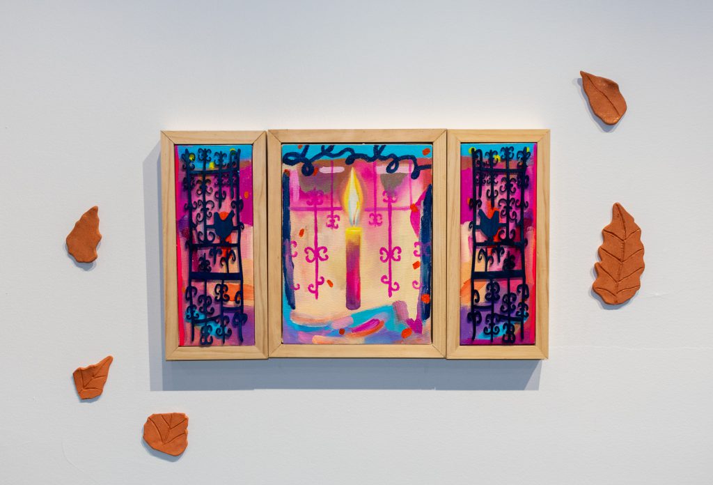 In her solo exhibition, Altars, she explores themes of identity, family dynamics, and the process of navigating the mundane and tragic circumstances of daily life. Drawing on her Mexican American upbringing and ties to Catholicism, Gonzales narrative works include symbolic elements from Catholic imagery and traditional metalwork found in the neighborhoods of her hometown. Her paintings depict the sharing of meals, tending to daily responsibilities such as caring for family chickens, connecting to nature and seeking spiritual connection through the lighting of candles. Intertwining these elements in triptych paintings embedded with traditional religious symbols, her reimagined altars emphasize community, unity, and daily routine as a new form of ritual and worship.